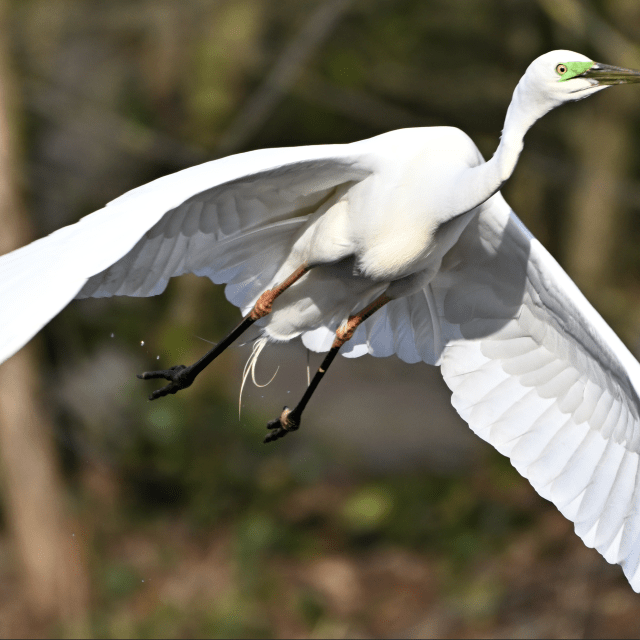 Great white heron flying by